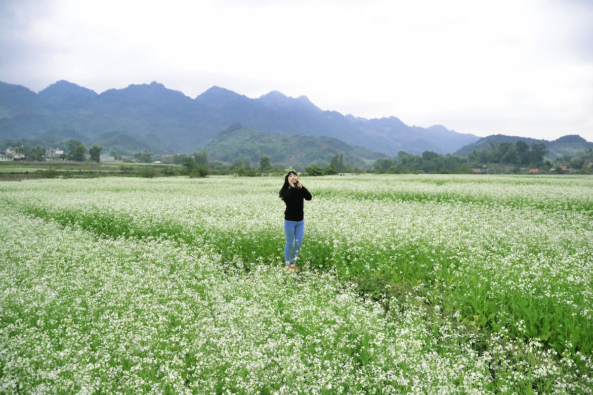 Mách nhỏ bạn những địa điểm tuyệt vời để chiêm ngưỡng vẻ đẹp của hoa cải đó là sau rừng thông bản Áng, các bản Ba Phách 1, 2, 3 và khu vực Ngũ Động Bản Ôn. Trong đó, sau rừng thông bản Áng lại thu hút hơn cả, với hàng chục hecta hoa cải trắng, du khách sẽ tưởng chừng như hoa cải trắng đuổi mãi không đến, chạy đến tận chân trời xa xăm.