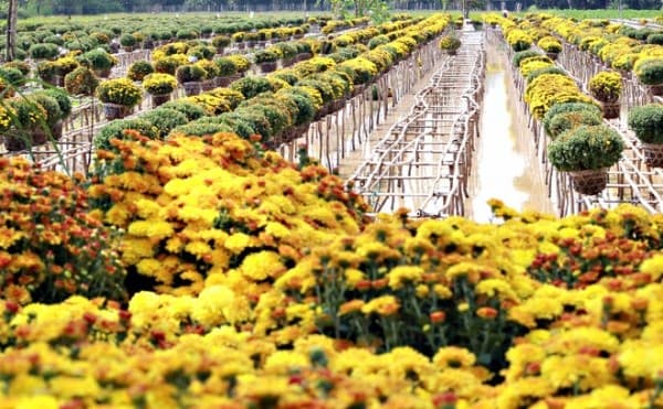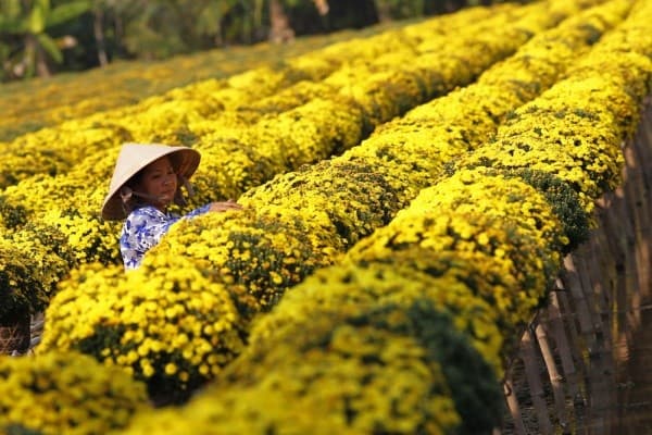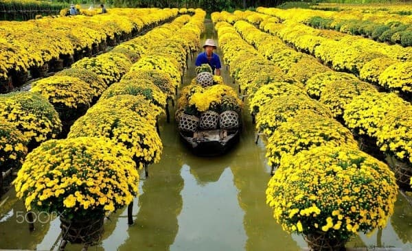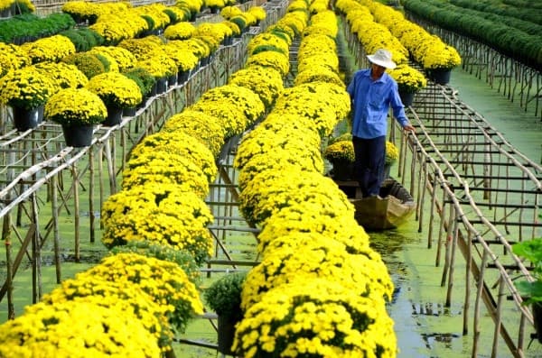 Với vị trí gần Sài Gòn nhất trong số các làng hoa nổi tiếng miền Tây (cách khoảng 70 km), Mỹ Tho là nơi nhiều du khách tìm đến ngắm hoa và chụp ảnh mùa giáp Tết. Đến đây, bạn chắc chắn sẽ cảm thấy chộn rộn Tết khi trông thấy những người chăm sóc hoa, vận chuyển hoa đi bán.