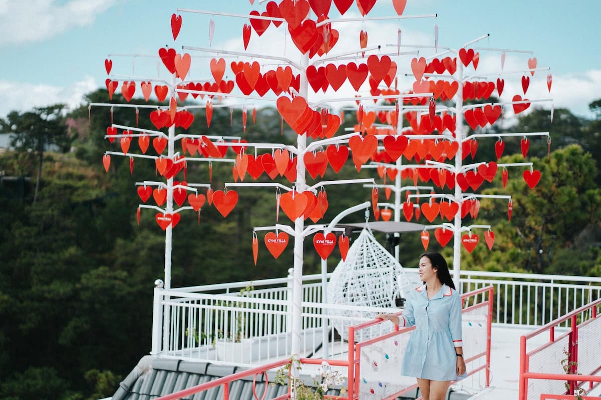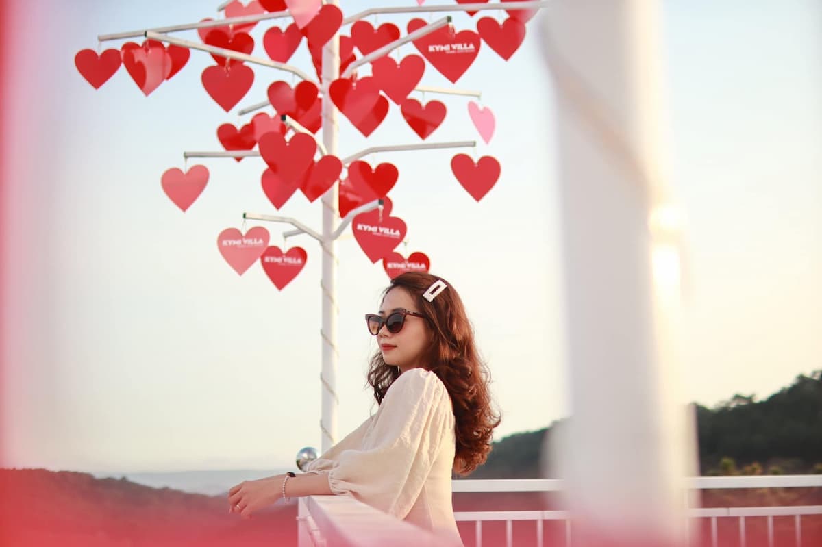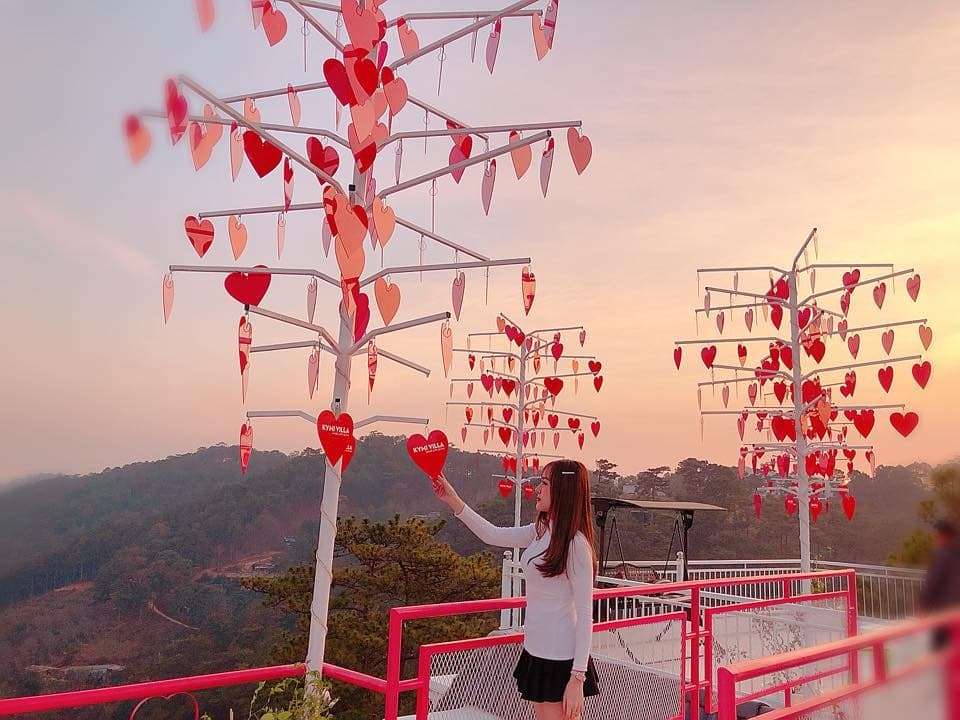 Cây cầu trái tim thuộc Kymi Villa Đà Lạt, là một khu tổ hợp: homestay lơ lửng, lưng chừng thung lũng; quá cafe nằm giữa đồi thông xanh với nhiều background ‘’lên hình’’ cực xinh như cây cầu sống ảo, cây ước nguyện, cối xay gió, xích đu đôi… Quá nhiều góc máy xinh xinh đã chinh phục trái tim của các ‘’tín đồ sống ảo’’.