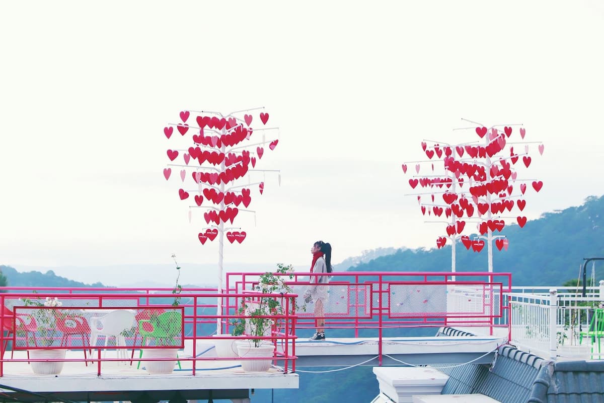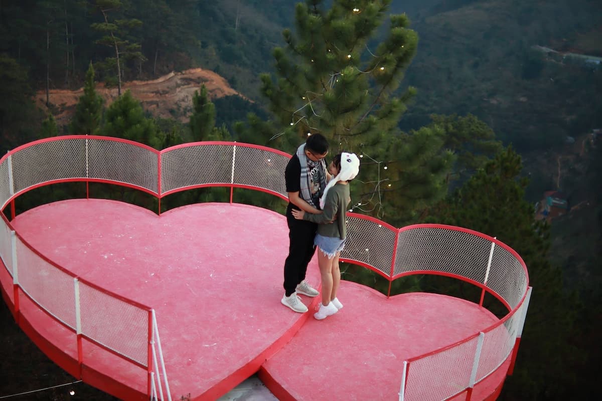 Trái tim hồng nằm giữa phông xanh ngút ngàn của rừng thông nên từ đây thả hồn buông thả xa xăm thôi cũng thấy thanh bình, thảnh thơi rồi. Đúng là 1 nơi sống ảo không lối thoát dành cho các cặp đôi. Với ngần ấy view đẹp tại cây cầu trái tim này, bạn sẽ có cả kho ảnh sống ảo mà post cả năm. Còn chần chờ gì nữa mà không rủ crush lên đường đến Đà Lạt ngay thôi.