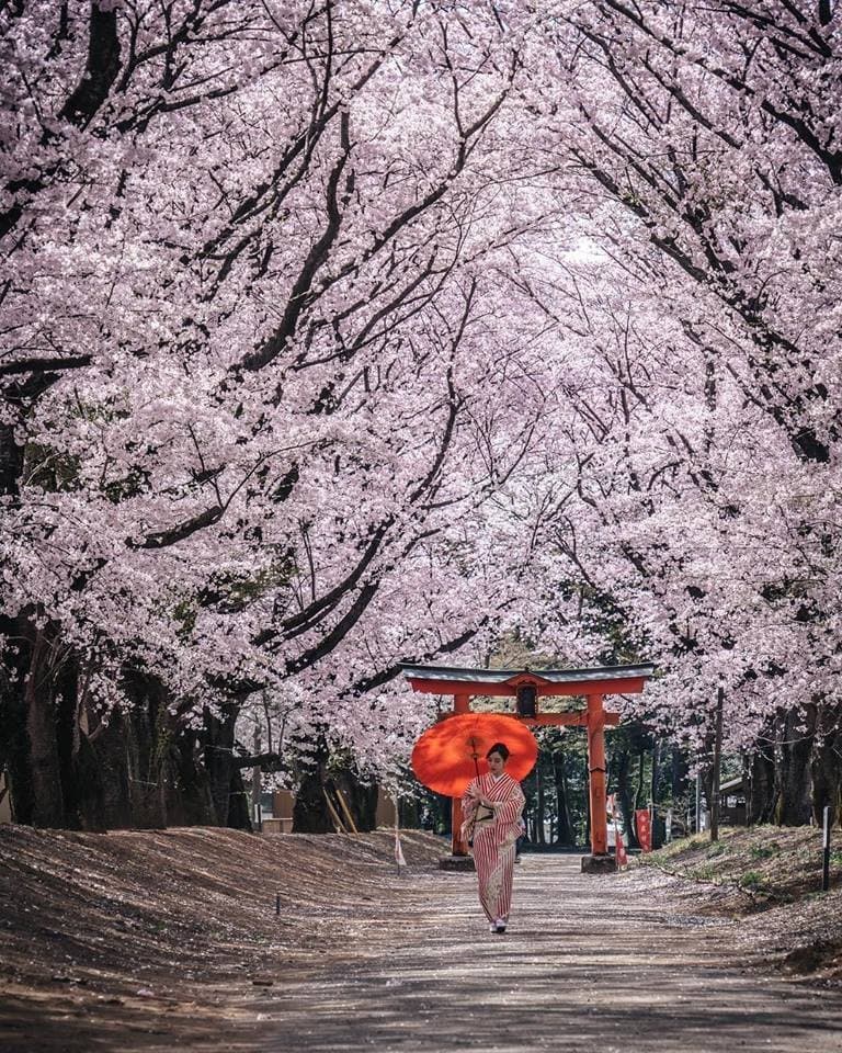 Trang phục truyền thống dưới hàng hoa anh đào là một trong những hình ảnh đặc trưng của người Nhật. (Ảnh sưu tầm)