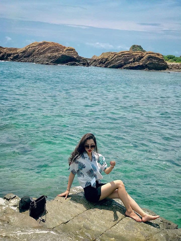 Nước biển ở đây luôn có màu xanh ngắt đẹp nao lòng, màu xanh phản chiếu ánh mặt trời, đổi các sắc thái xanh khác nhau mỗi khi có những con sóng nhỏ dập dìu nối đuôi nhau vào bờ. ( Ảnh: Hằng Đỗ)