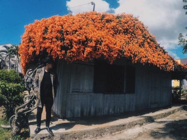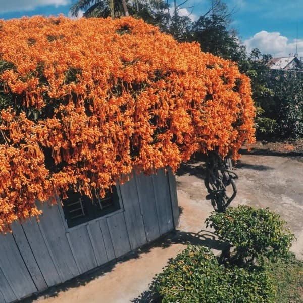 Nhà xây bằng gỗ rất giản dị và mộc mạc, tuy nằm khuất bên trong nhưng bạn dễ dàng nhận dạng nhờ mái hoa màu cam nổi bậtt. Người ta gọi hoa trên mái nhà là hoa Rạng Đông, Hừng Đông hay Chùm Ớt. Người ở quê thường trồng hoa này làm hàng rào vì chúng dễ thích nghi với điều kiện môi trường tự nhiên, nhanh phát triển mà không cần tốn nhiều công chăm sóc. Chủ nhà này dựa vào đặc tính đó để tạo nét độc đáo cho mái nhà, lại vừa mát mẻ hơn so với mái ngói thông thường.