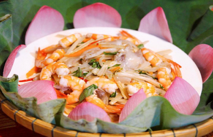 Đất Tháp Mười nổi tiếng với những đầm sen rộng bát ngát, vì thế những món ngon Đồng Tháp được làm từ sen cũng nằm trong top đầu danh sách phải thử với bất kỳ thực khách nào mỗi khi du lịch Đồng Tháp. Nổi tiếng nhất trong số đó chính là gỏi ngó sen trứ danh. Món ăn được làm từ ngó sen - phần non nhất của cọng sen, trộn cùng các loại gia vị chua ngọt, rau thơm, thịt xé hoặc tôm luộc để tăng thêm vị thơm ngon.
